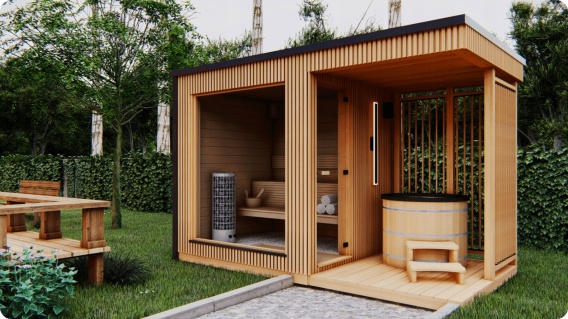 Sauna ogrodowa z panoramicznym oknem Piec 9kW z modułem WIFI Balia